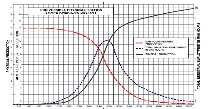 The organisation argues that developments in mechanisation have caused a massive shift of employment towards the service sector and that money creation and distribution jobs such as banking, insurance, etc. could be eliminated with the use of energy accounting.[6] Further increases in efficiency and productivity mean that most of the tasks performed by human employees could be reduced or eliminated through better management, automation, and centralization. These trends could signal an increase in both production possibilities and leisure time since more can be produced with less human labour and many money related and service related jobs could thus be eliminated. Within a market system, however, increased productivity often leads to downsizing because companies need fewer workers, and also lower wages because of job competition. These conditions reduce purchasing power in a price system, which makes that system ultimately untenable in a technological society, or so goes that argument.